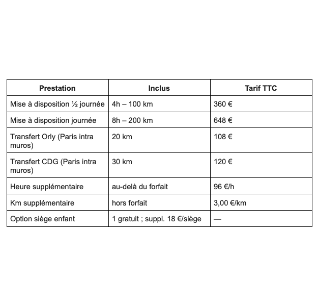 - Attente incluse : 15 minutes pour transferts aéroports, puis facturation horaire.
