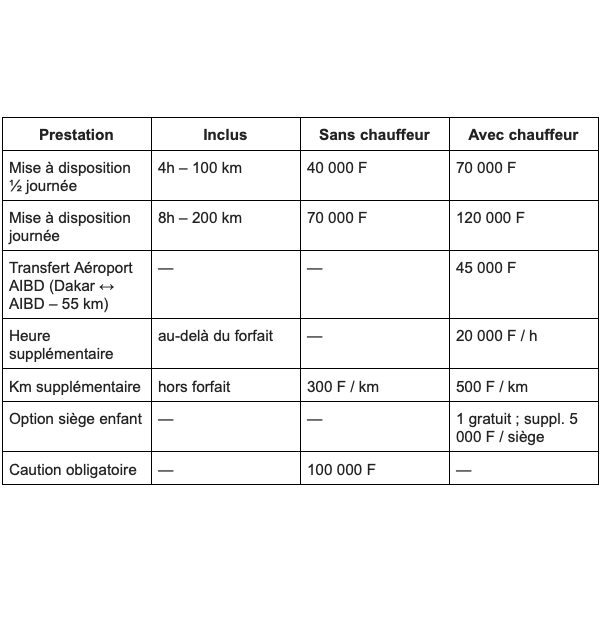 • Hors zone (Thiès, Mbour, Rufisque, etc.) : supplément au km ou devis personnalisé.